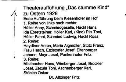Aus einem Zeitungsbericht der Mühlviertler Nachrichten vom 08.05.1954: "Die hiesige Theaterrunde wird in mehreren Vorstellungen das vom hiesigen Heimatkundler Hr. Josef Etzlstorfer verfasste Theaterstück "Das stumme Kind" nach Ostern zur Aufführung bringen. Vor mehr als 25 Jahren erzielte der Dichter mit diesem Stücke großen Erfolg und auch diesmal werden viele Besucher erwartet."